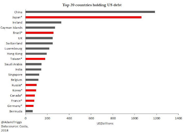 As well, consider the Triffin dilemma, which states that the country whose currency is the global reserve currency must be willing to supply the world with an extra supply of its paper to fulfill world demand for these foreign exchange reserves, thus leading to a current account deficit. Notwithstanding Trump`s obsession with trade deficits, foreigners have been financing US trade deficits by buying USD assets. As the chart below shows, it is no surprise that the two largest holders of US debt are China and Japan, which have been running sustained current account surpluses for years.