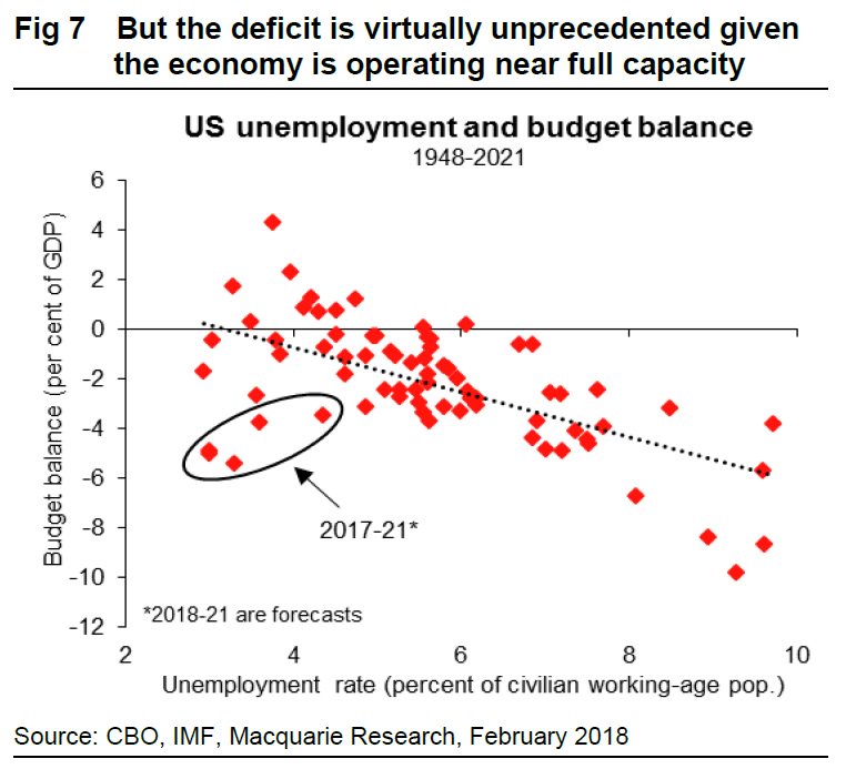 In the wake of widespread worries over the Republicans’ latest fiscal experiment with tax cuts during the late phase of an expansion, a number of strategists have voiced concerns about the downward pressure that exploding fiscal deficits would put on the US Dollar. Macquarie pointed out that priming the fiscal pump during a period of low unemployment is highly unusual.