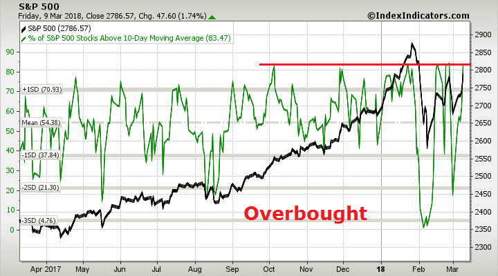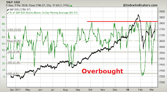 While the market is exhibiting strong “good overbought” momentum which is supportive of higher prices, there could be a brief pause or pullback early in the week. Breadth indicators from Index Indicators show that market is overbought at multiple time frames.