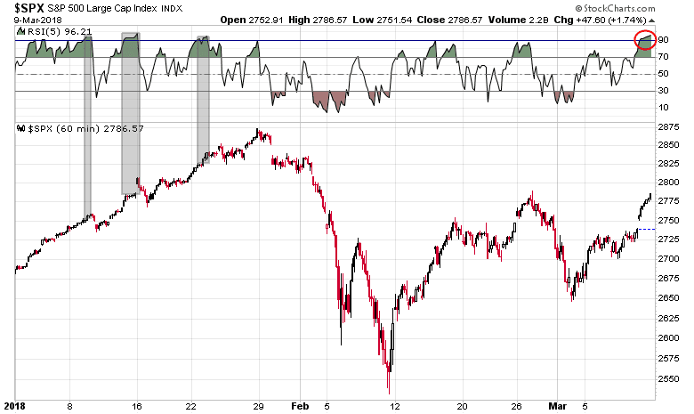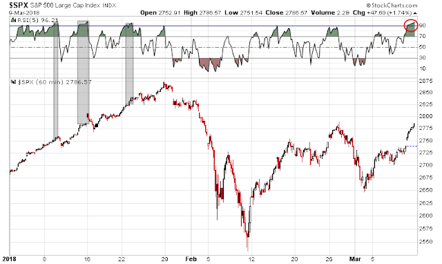 Hourly RSI-5 of the SPX has exceeded the highly overbought 90 level, which is not a sustainable condition. Even during the January melt-up, similar past episodes had seen the market either pause or weaken under such conditions.