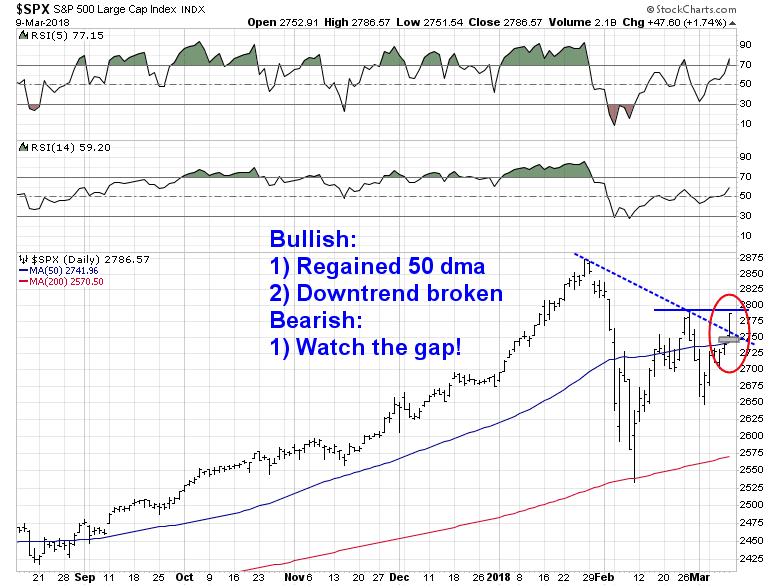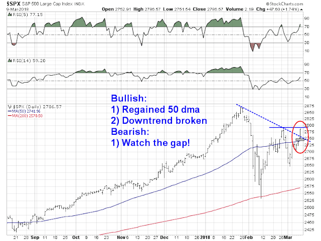 From a technical perspective, the SPX regained the 50 day moving average (dma) and rallied through a downtrend line. It is now testing a short term resistance level defined by the February highs. The near-term downside risk may see the market decline to close the gap set last Friday, which stands just above the 50 dma.