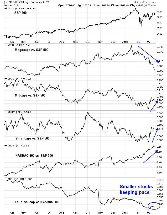 This chart of breadth by market cap presents a mixed but constructive picture. Both mid and small caps are staging comebacks relative to SPX, while megacaps (XMI) are underperforming. NASDAQ 100 is the clear leadership, though the equal weighted NASDAQ 100 is lagging the cap weight index. I interpret these readings of mid and small cap revival as bullish (troops leading generals). While some analysts have raised concerns about narrowness of NASDAQ leadership, the recent performance of the equal vs. cap weighted NASDAQ 100 shows that the smaller stocks in that index are keeping pace in this rally.