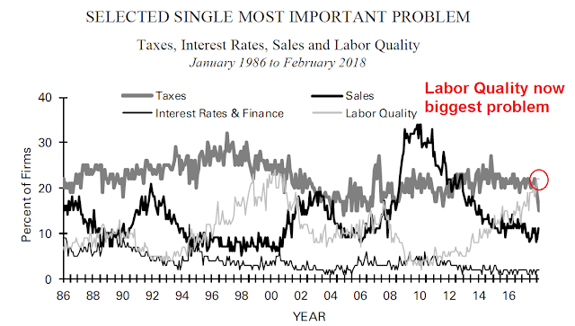 While the latest NFIB small business optimism survey surged to new highs, its internals reveal a number of disturbing internals beneath the surface. The survey of “single most important problem” shows that labor quality has rising to be the biggest problem, which is indicative of an overheating labor market that will undoubted concern Fed officials.