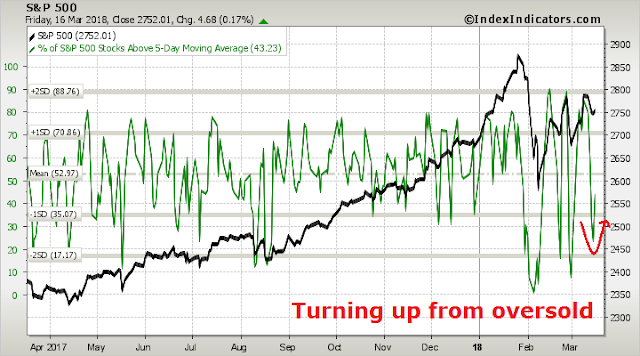 Short term breadth indicators have turned upwards from an oversold reading, which is also short-term bullish.