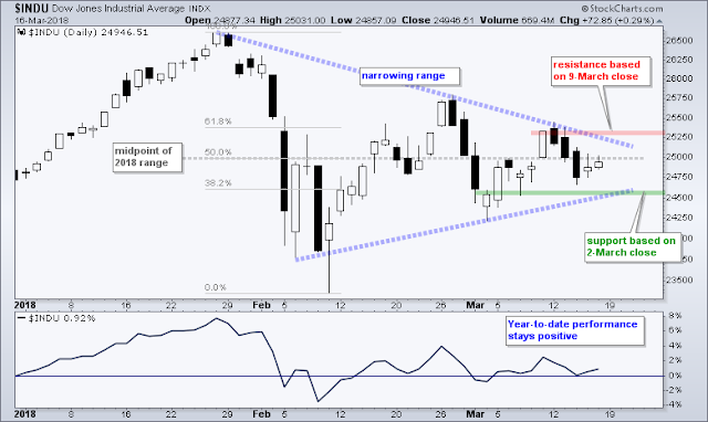 Arthur Hill identified a coiling formation in the DJIA and wrote that he “would still treat the consolidation as neutral and take [his] cue from the next directional break”.