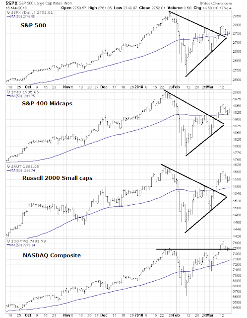 As Hill waits for the directional break, we can get some clues as to the direction of the break by observing the other major US equity market indices, from large caps to small caps, as well as the NASDAQ. All have broken out upwards. All are above their 50 day moving averages (dma). The NASDAQ Composite staged an upside breakout and it is now testing the breakout level turned support.