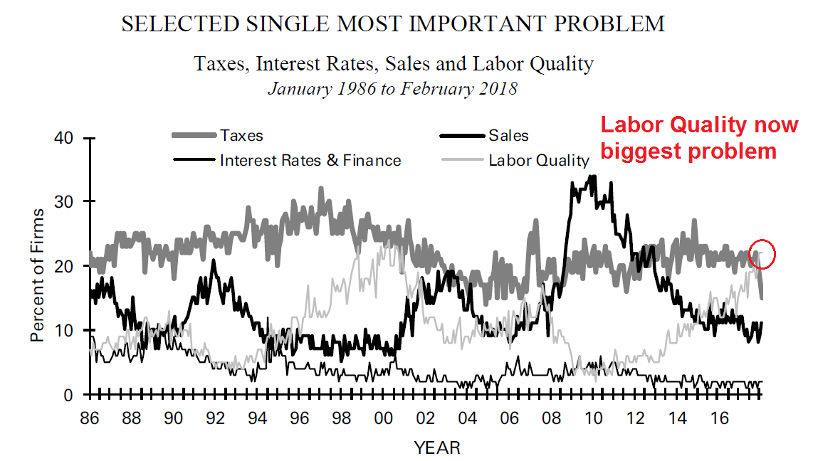 While the latest NFIB small business optimism survey surged to new highs, its internals reveal a number of disturbing internals beneath the surface. The survey of “single most important problem” shows that labor quality has rising to be the biggest problem, which is indicative of an overheating labor market that will undoubted concern Fed officials.