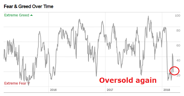 The Fear and Greed Index has fallen to 19, which is an oversold condition indicating a possible short-term sentiment washout.