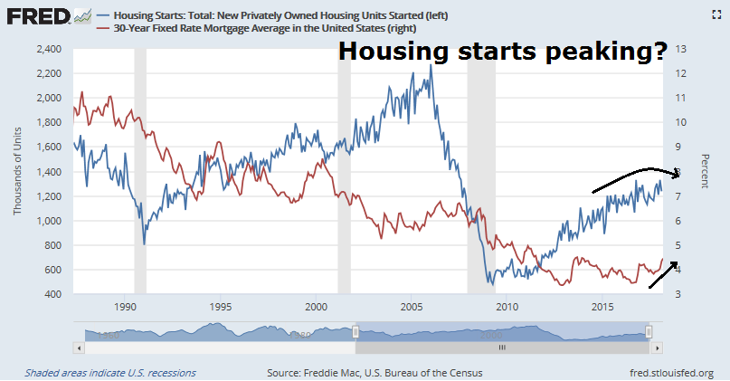 While retail sales measure current consumption, data series such as housing starts are more indicative of durable goods demand. The latest update on housing starts reveal a market that has plateaued and may be peaking. The combination of rising mortgage rates, and material costs of lumber and steel from trade actions are becoming headwinds in this highly cyclically sensitive sector of the economy.
