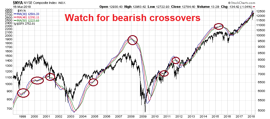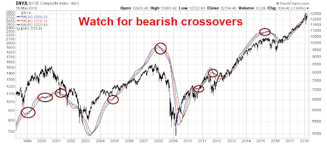 From a technical perspective, one clue of a market top may come from Chris Ciovacco’s trend models. Ciovacco monitors the 30, 40, and 50 week moving averages of the NYSE Composite. If they start turning down, then it would be a signal to reduce risk.