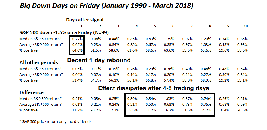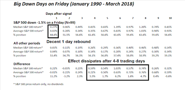 It is not my normal practice to engage in this kind of analysis as it borders on torturing the data until it talks. However, my own study using the same time frame shows that the market had a decent one-day rebound, and the rebound effect dissipated after 4-8 trading days. (Data and spreadsheet available upon request in the interest of full transparency).