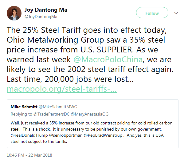 Here is another. Steel prices jumped by 35% from an American supplier.
