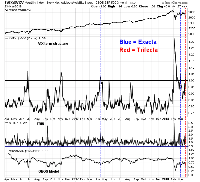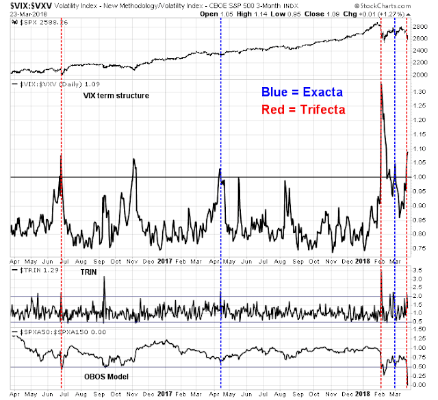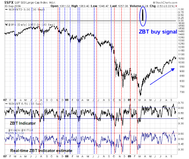 Here is the track record of this model during the 2007-09 period. The term structure of the VIX Index was unavailable for much of 2007, and therefore we will have to make do with analyzing the performance of this model for 2008-09. This OBOS component of this model (bottom panel) went a little haywire because of the nature of the 50 and 150 day moving averages. Nevertheless, we can observe that the behavior of this model was similar to the ZBT oversold indicator. It did not perform well during the cascading bearish period when the oversold market became more oversold.