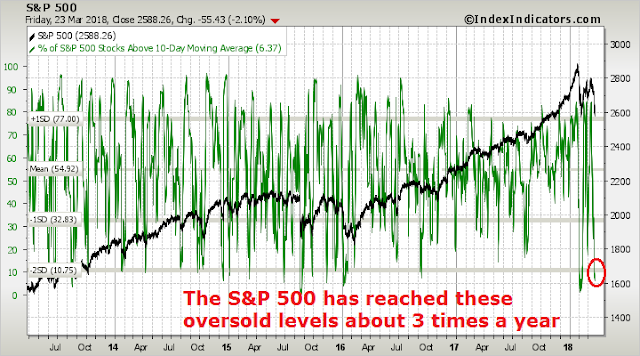 On a longer term (1-2 week) time horizon, the market has reached these oversold levels just under once a year in the last five years.