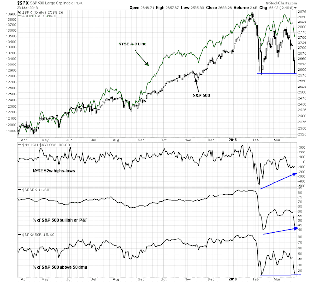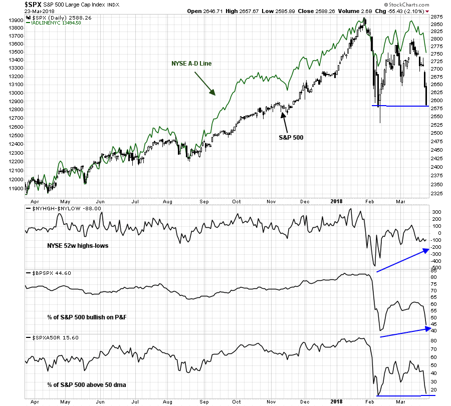 Finally, the history of past major bear markets has been preceded by signs of technical deterioration. Even as the SPX tests support at its February lows, there are no signs of negative breadth divergences and a few signs of positive divergences.
