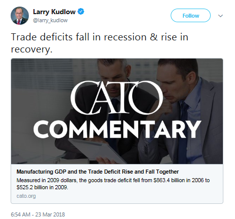 There is resistance within the Republican Party. Already, Larry Kudlow is trolling his new soon-to-be boss. Trade deficits are a sign of economic strength, not weakness.