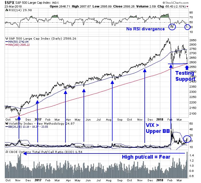 As a result, the SPX fell -6.0% for the week. The market is obviously stretched to the downside. The SPX is testing support at its February lows and the 200 day moving average (dma). The VIX Index has risen above its upper Bollinger Band, which is a short-term oversold signal. As well, the CBOE put/call ratio spiked to high levels indicating fear.