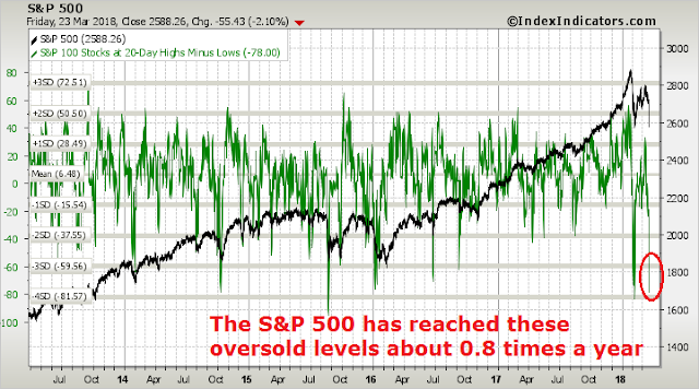 This breadth chart from Index Indicators show that it is oversold on a short-term (3-5 day) horizon. It has reached these oversold levels about three times a year in the last five years.