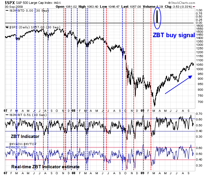 Here is a chart of the ZBT oversold conditions during the 2007-09 period. The blue vertical lines show the instances where the market became oversold according to this indicator and experienced a short-term rally afterwards. The red vertical lines show the instances where the oversold signal failed and the market continued to fall. The lessons from this period in history tells us about how oversold markets can become more oversold. It was mostly during the steep declines and terminal phases of the bear market when these oversold conditions failed as buy signals.