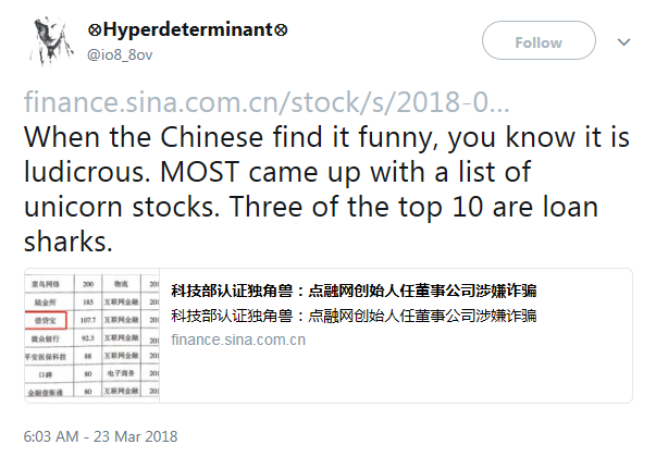 Speaking of debt, Here is one ominous observation that speaks for itself. Three of the top 10 Chinese unicorns are loan sharks (Sina article in Chinese).