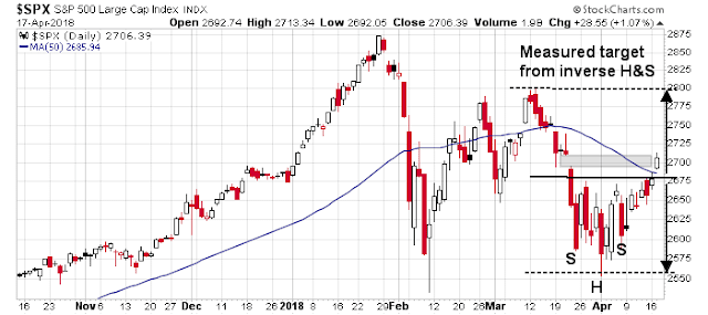 Mid-week market update: Don’t get me wrong, I am still bullish, but the stock market rally appear a little extended in the short run and due for a brief period of consolidation. The SPX broke out from its inverse head and shoulders (IHS) pattern this week, cleared its 50 day moving average (dma), and filled in the gap from March 22. The next upside objective is the IHS objective of 2790-2800, whic coincides with resistance defined by the highs set in late February and March.