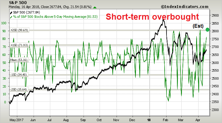 I am seeing a number of short term (2-5 day) cautionary signals. Breadth indicators from Index Indicators are flashing highly overbought signals.
