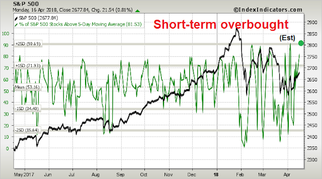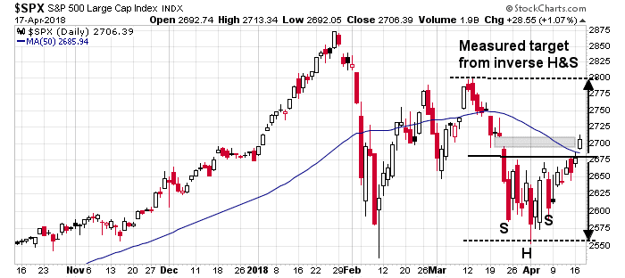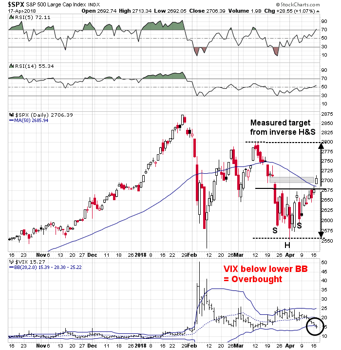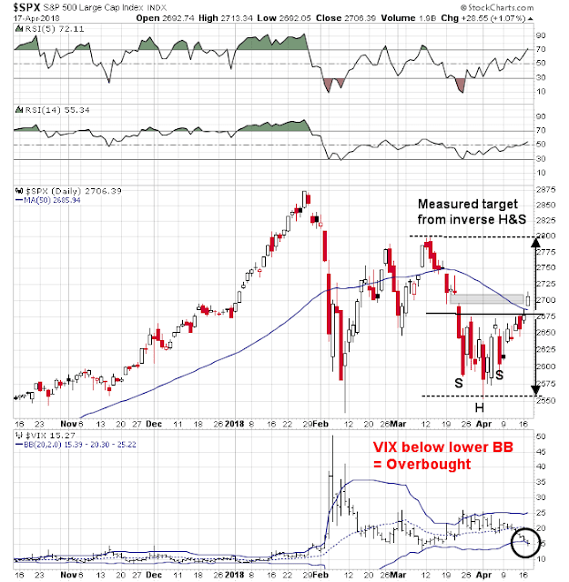Mid-week market update: Don’t get me wrong, I am still bullish, but the stock market rally appear a little extended in the short run and due for a brief period of consolidation. The SPX broke out from its inverse head and shoulders (IHS) pattern this week, cleared its 50 day moving average (dma), and filled in the gap from March 22. The next upside objective is the IHS objective of 2790-2800, whic coincides with resistance defined by the highs set in late February and March.