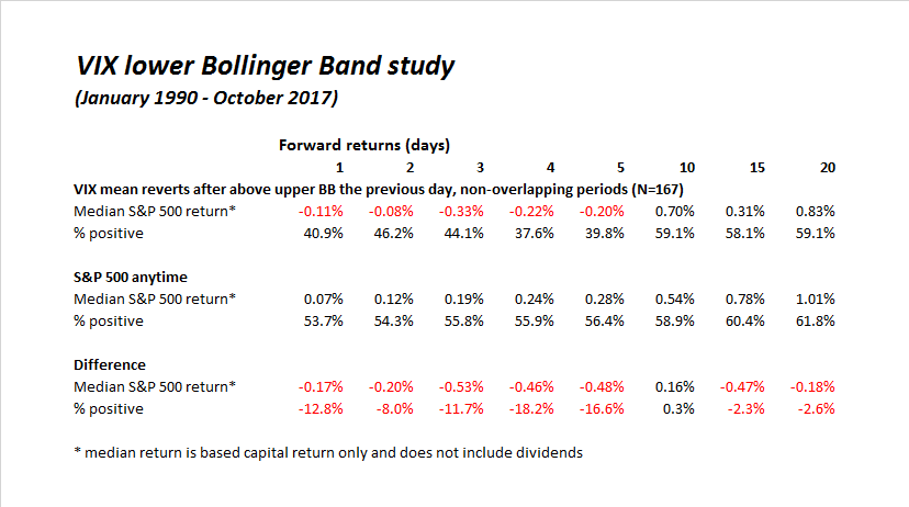 This is a setup for a sell signal for the stock market. The table below depicts a study I did last October. When the VIX falls below its lower BB and mean reverts, which hasn’t happened yet, equity returns have been subpar. However, the results are not compelling enough to go short.