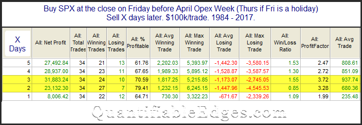 This week is option expiry week. Rob Hanna of Quantifiable Edges documented in the past that April OpEx is one of the strongest OpEx weeks of the year, but further investigation revealed that the market tends to peak out on the Wednesday of April OpEx and treads water for the rest of the week.
