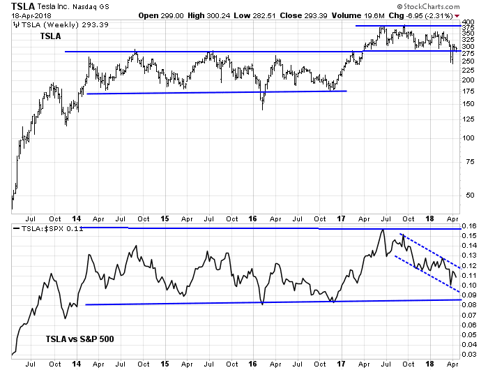 The chart of the stock price shows two ranges, with the stock in the lower part of a higher range. However, the lower panel of the chart shows that the stock remains range bound relative to the market, though the stock is tracing out a minor falling channel.