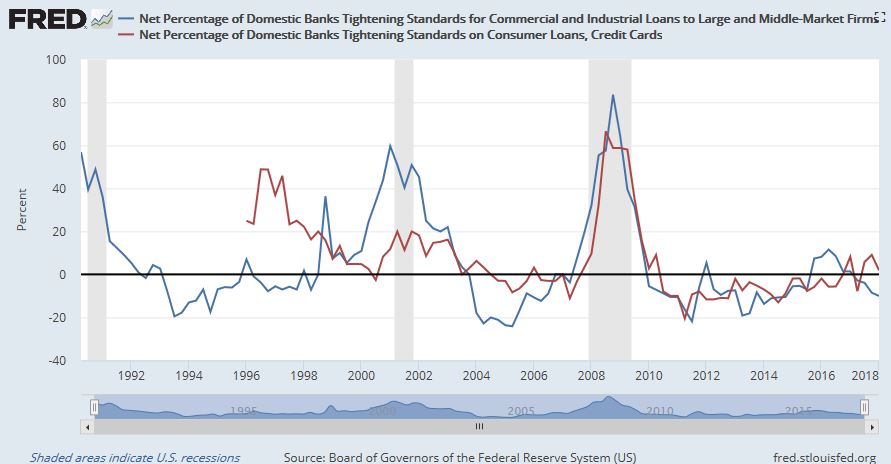 A more timely data series are the Chicago Fed`s Financial Conditions Index, and the St. Louis Fed`s Financial Stress Index. Current conditions show that Stress levels are starting to rise, though the absolute stress levels remain low. Both of these data series are released monthly, which is more timely than the lending officer surveys.
