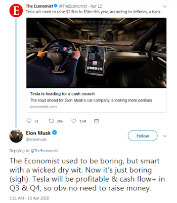 One of the functions of recessions is to unwind the excesses of the previous cycle. The finances of Tesla (TSLA) is the poster boy of the this expansion. Recently, Tesla CEO Elon Musk shot back a reply to an article in The Economist which indicated that the company needs to raise $2.5b to $3b this year as it continues to burn cash.