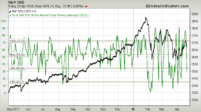 From a fundamental viewpoint, equity valuations are not especially demanding when compared to bonds. The market started to get concerned last week when the 10-year yield approached 3%, but some perspective is in order. As the following chart shows, FactSet reported that forward P/E ratio is in the middle of its 5-year range. By contrast, the 10-year yield is near the top of its 5-year range, indicating slightly equities are cheap relative to Treasuries. On a 10-year perspective, however, the forward P/E is above its historical range and so is the 10-year yield. Depending on your time horizon, valuations are either slightly cheap or slightly expensive, but levels are nothing to panic over.