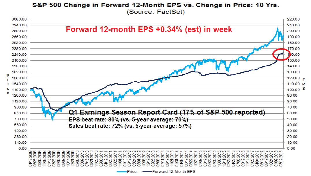In addition, earnings are continuing to rise. Results from Q1 earnings season have been solid, with above average EPS and sales beat rates. In addition, forward 12-month EPS are rising, indicating positive fundamental momentum.