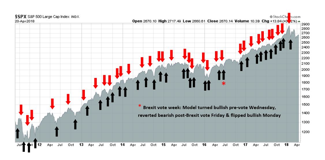 “I expect that the market will pause and consolidate its gains for the next 2-5 trading days before resuming its upward path. The trading model remains bullish and the “arrow” is still pointing upwards.”