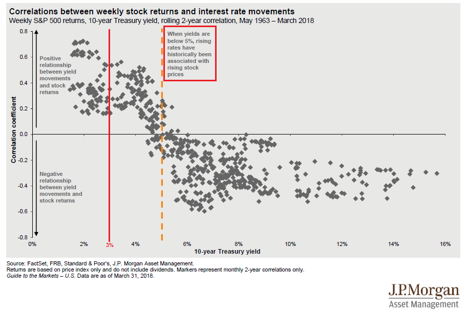 Mid-week market update: What should we make of the stock market now that the 10-year Treasury yield has breached the 3% level? Should we pay attention to the JPM Asset Management historical analysis which stated, “When yields are below 5%, rising rates have historically been associated with rising stock prices”?