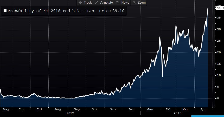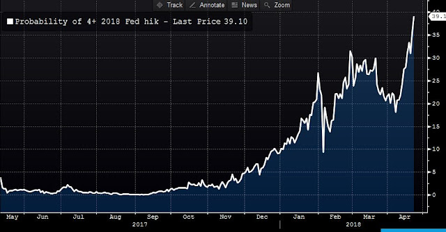 If Ranson is right and Q1 GDP sees an upside blowout surprise, will stocks rally or deflate? That will be the litmus test of market psychology. The Fed has signaled that its base case is three rate hikes this year, with four hikes a definite possibility. The probability of four hikes is rising quickly.