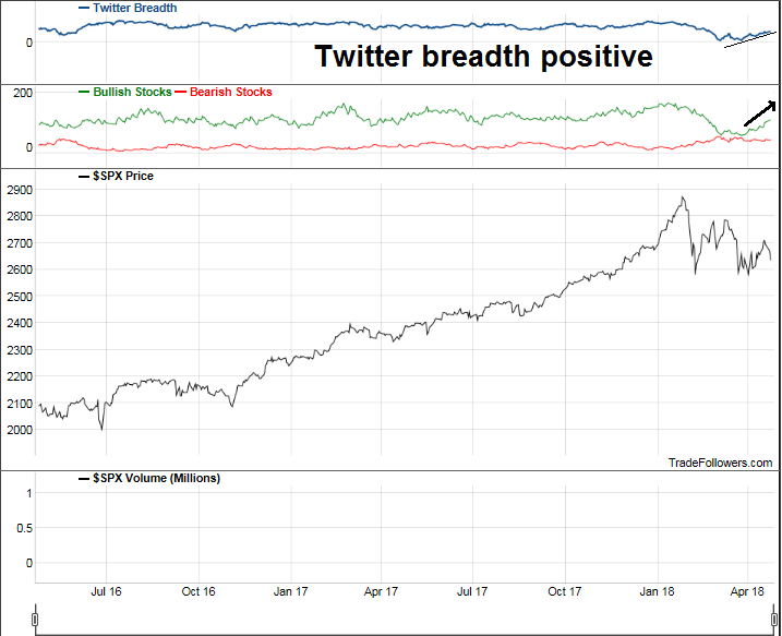 Twitter breadth, as measured by Trade Followers, has been trending positive for the last few weeks. In particular, bullish breadth has been rising even as the market consolidated sideways, which is bullish.