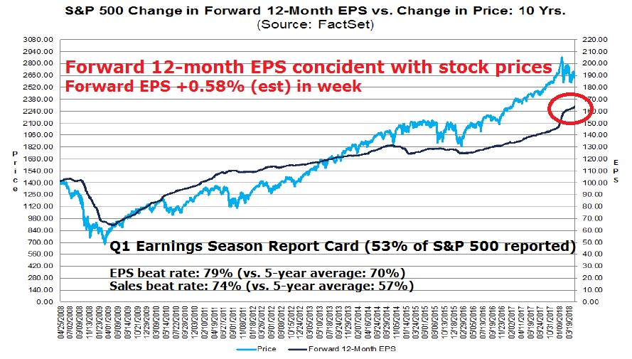 What about earnings growth? The results from Q1 earnings season has been solid. The latest update from FactSet shows that both the EPS and sales beat rates are well above their historical averages. Consensus EPS estimates rose in response to the upside earnings surprise. From a longer term perspective, forward 12-month EPS changes are roughly coincident with stock prices. While upward earnings revisions are not bullish signals in isolation, they do serve as a confirmation of the direction of Street expectations.