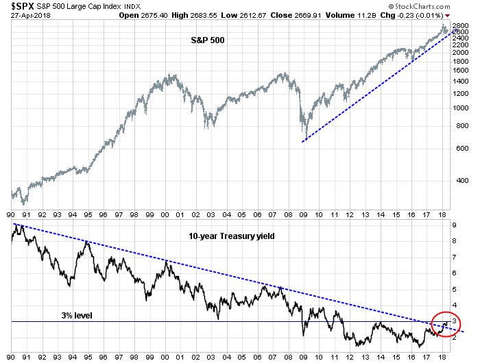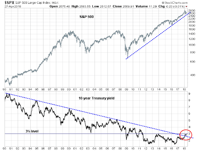 What about the problem of rising yields? 2-year Treasury yields have been rising steadily since the Fed began its tightening cycle, and 10-year yields are near the 3% level. When do higher rates start to hurt stock prices?