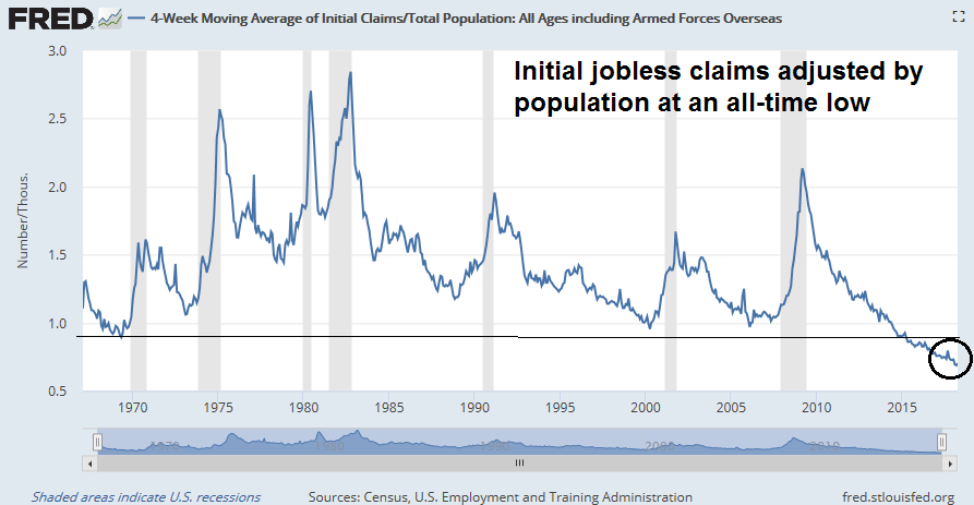 Still, it is too early to get too bearish on equities just yet. There are few signs of a bull market killing recession in sight. Initial jobless claims provide a timely high frequency pulse of the American economy. There was much excitement last week when initial claims fell to the lowest level since 1969. For a better perspective, initial claims adjusted for population has been steadily declining and making all-time lows in this expansion cycle.