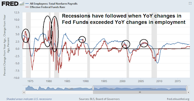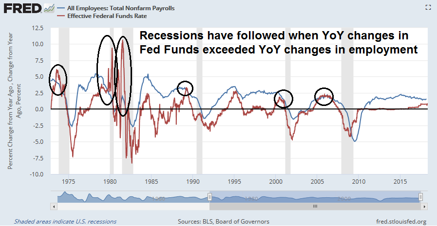That leaves the Fed. The Fed is undergoing a tightening cycle. Instead of asking when rising rates are likely to hurt the stock market, the better question is when rising rates is likely to slow economic growth. Historically, recessions have followed whenever the YoY changes in Fed Funds rates have exceeded the YoY change in employment. This indicator is getting close to a recession signal, and I will be watching the April Jobs Report closely Friday to see how it is evolving.