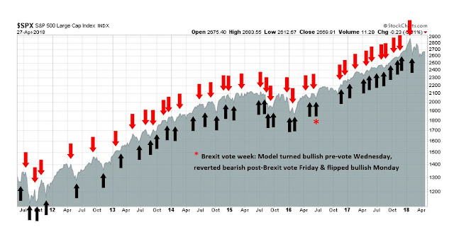 Update schedule: I generally update model readings on my site on weekends and tweet mid-week observations at @humblestudent. Subscribers receive real-time alerts of trading model changes, and a hypothetical trading record of the those email alerts is shown here.