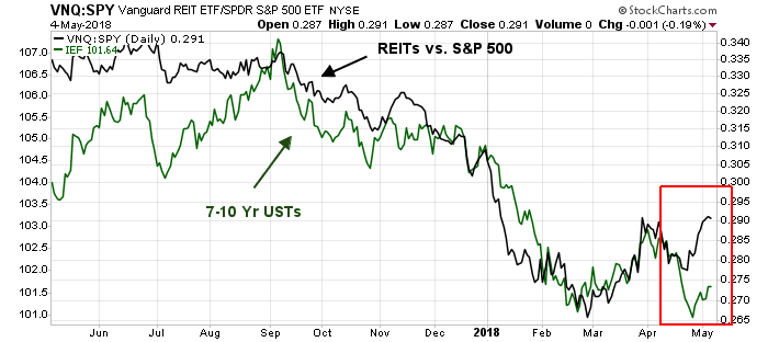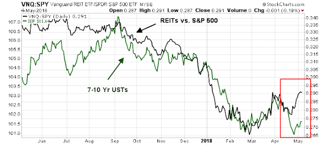 Bond yields retreated in response to the dovish message, but interest sensitive sectors such as REITs and utilities had already reacted in anticipation. The accompanying chart shows the relative market returns of REITs overlaid on top of 7-10 year Treasury returns. While the two had tracked each other closely, the divergence in the last couple of weeks may be attributable to a market reaction to excess supply from Treasury auctions.
