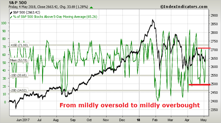 Medium term (3-7 day) breadth indicators are in neutral. If the bulls are truly in control of the tape, then the market needs to move this indicator into the target overbought zone.