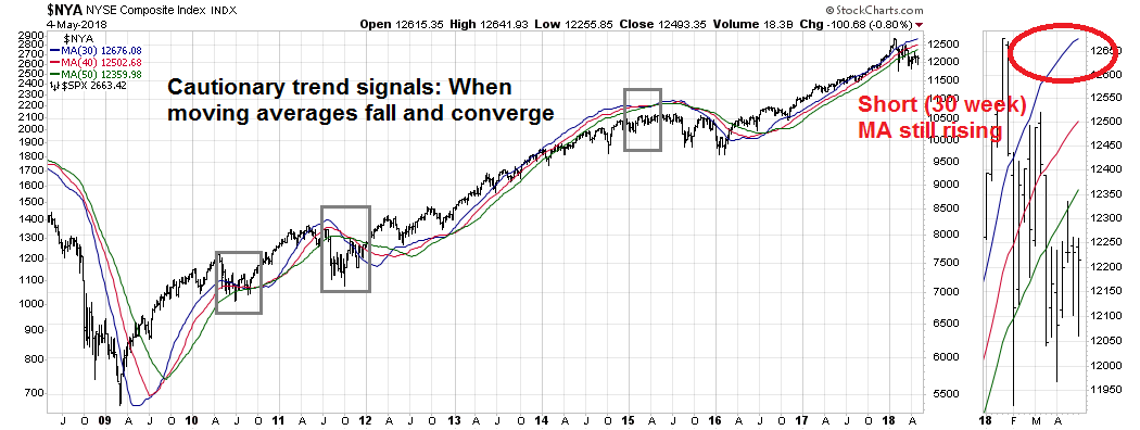 Ciovacco proposed using MAs of the NYSE Composite for his signals, which is what I did. I further superimposed the S&P 500 on top of the MAs for information purposes. That’s why that chart may look confusing. Sorry I didn’t make that clear.