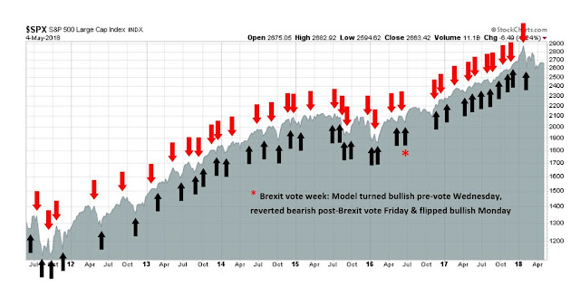 My inner trader uses the trading component of the Trend Model to look for changes in the direction of the main Trend Model signal. A bullish Trend Model signal that gets less bullish is a trading “sell” signal. Conversely, a bearish Trend Model signal that gets less bearish is a trading “buy” signal. The history of actual out-of-sample (not backtested) signals of the trading model are shown by the arrows in the chart below. The turnover rate of the trading model is high, and it has varied between 150% to 200% per month.