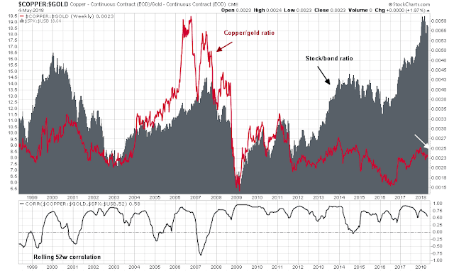 History shows that the lumber/gold ratio has been an excellent indicator of risk appetite. The bottom panel of the accompanying chart shows the rolling correlation of the lumber/gold ratio (cyclical indicator) to the stock/bond ratio (risk appetite indicator). The lumber/gold ratio is rising, which is a buy signal for risky assets.