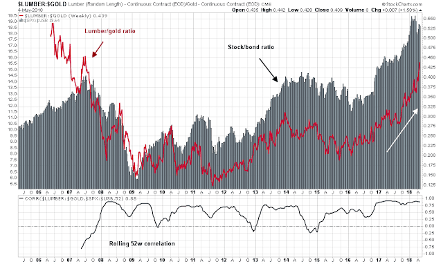 I began this post with the rhetorical question of which indicator investors should believe, the lumber/gold ratio or the copper/gold ratio? An analysis of the two ratios, as well as the Korea/ACWI ratio, shows that the bullish cyclical conclusion of the lumber/gold ratio as the outlier. The lumber/gold ratio has been affected by specific factors relating to US building materials market.