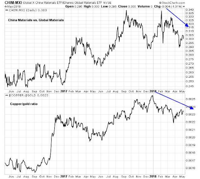 Copper has its own idiosyncrasies too. Long before China became the dominant global growth engine, copper was regarded as a good indicator of global cyclicality. Now that China has become the largest consumer of commodities, copper prices are reflective of Chinese economic activity. The chart below shows the ratio of China Materials ETF (CHIM) to Global Materials (MXI) in the top panel, and the copper/gold ratio in the bottom panel. The coincident weaknesses of the CHIM/MXI and copper/gold ratios are probably reflective of softness in China.